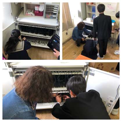 また、授業中に使用する1人1台タブレットを3年生の新クラスごとに保管しなおす作業を行いました。