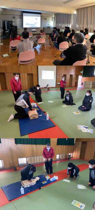 平野消防署の皆さんにお越しいただき、救急救命についての映像や、心肺蘇生法、AEDの使用方法についてご指導していただきました。