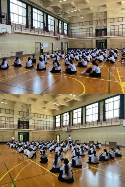 1年生は体育館でキャリア教育の一環である『進路学習』を行いました。担当の先生から進路選択や卒業後の仕事についてお話がありました。中学校に入り2ヶ月、少しずつ学校生活には慣れてきたかもしれませんが、卒業後の進路に向けてはまだイメージできている人は少ないと思います。今回のことを『きっかけ』にして、ぜひ進路や将来の夢について考えてください。そして『今』を大切に、期末テストに向けてしっかり自学自習してください。