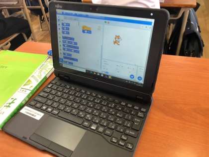 プログラミングと聞くと難しいイメージがありますが、本時はスクラッチという学習教材を使い、プログラミングの仕組みを学びました。