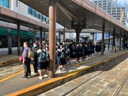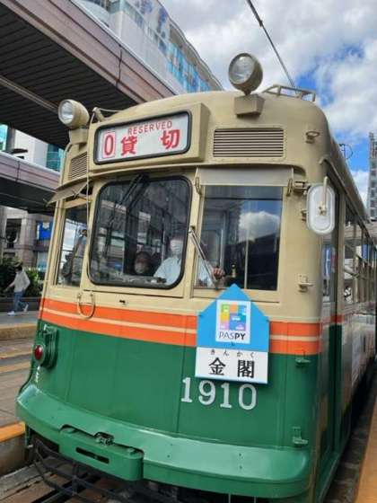広島電鉄の貸切車両に乗って、原爆ドーム前駅に向かいます。