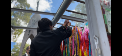 学校で作った千羽鶴を奉納し、黙祷を行いました。