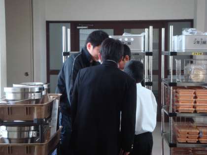 4/13(月)エレベーターホールの所まで、配膳室から運ばれてきた給食のごはんやおかず、牛乳は、当番が各クラス取りに来ます。