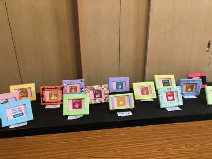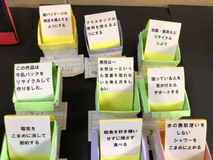 SDGsをテーマに、ダンボールで作った写真立てと牛乳パックで作った小物入れを作成しました。