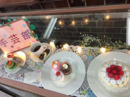 玄関前のガラスケースには、家庭科部がフェルトで作ったケーキなどのお菓子の作品が展示されています。