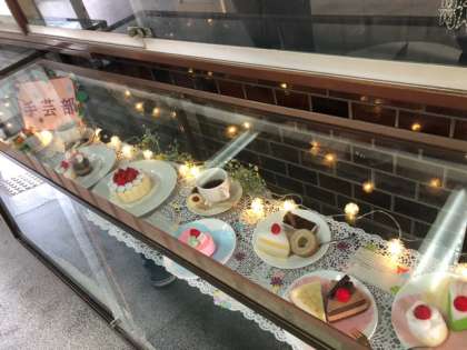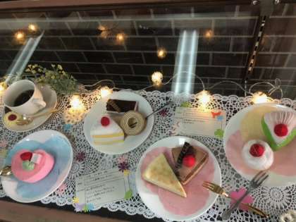 本物と見間違えるほど綿密で丁寧に作られたケーキが並び、カフェのショーケースのような空間ができています。