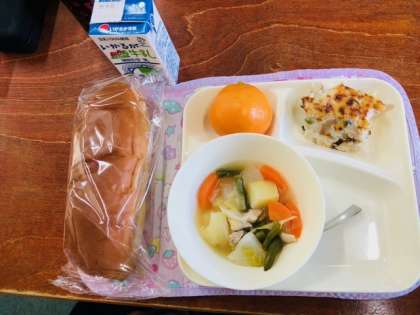 【今日の献立】 鶏肉とじゃがいものスープ煮 きのこのドリア みかん 黒糖パン 牛乳