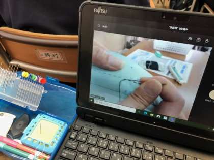 タブレットを使い、手元をカメラで映すことで、細かい作業もよくわかり、先生のお手本を見ながら作業に取り組むことができていました。