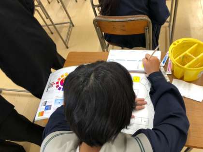 本時は絵の具の使い方の説明を受けた後、黄色を丁寧に塗りました。