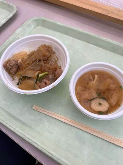 地元の有名なお醤油屋さんのお味噌を使った鶏丼とお味噌汁です。
