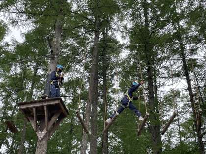 およそ8メートルの高さで丸太やロープを渡ります。上にあがると大人でも怖いほどですが、勇気を出して進んでいきます。
