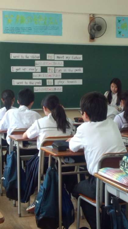 6月12日(金)教育実習生の研究授業がありました。2年生の英語科でした。不定詞の副詞的用法の学習でした。先生にあわせて、しっかり声を出し、英語の学習に取り組んでいました。