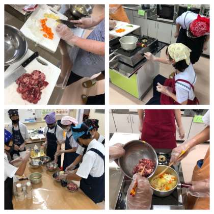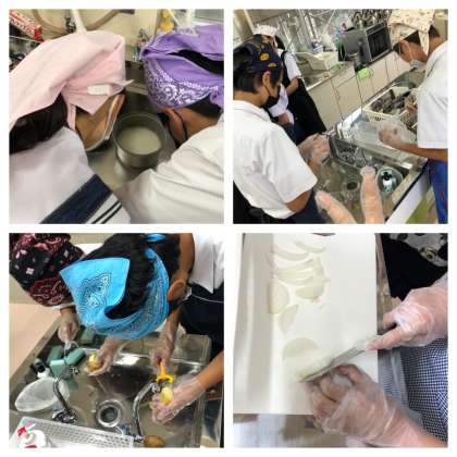 お米を炊いたり、野菜を切ったり炒めたりと役割を分担して班で協力して作りました。