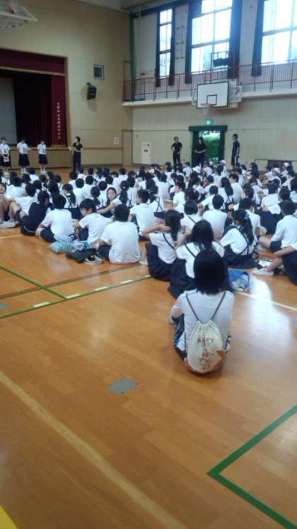 6月26日小学生の中学校見学会がありました。校区の瓜破北小学校と瓜破西小学校の6年生がやってきました。当日は、雨のため、残念ながら、運動場の部活動の様子を見てもらうことができませんでした。すべての部活動が、室内での紹介となりました。写真は、体育館に、集合した時の様子です。
