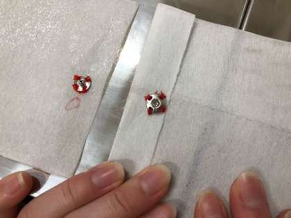 エコバッグ作りに向けて、スナップボタン付け、ミシンの使い方について学習しています。