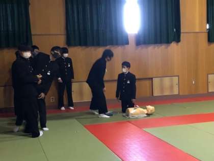 胸骨圧迫とAEDの使い方を学び、人形を使い実習しました。