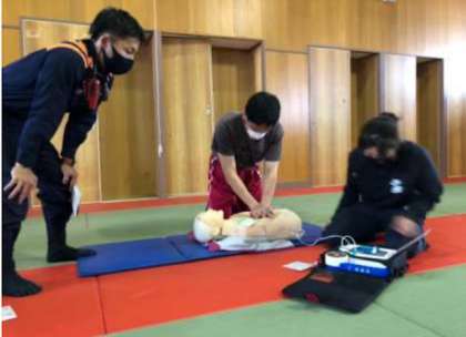 心肺蘇生法としての胸骨圧迫やAEDの使い方を学び、実技の講習も受けました。