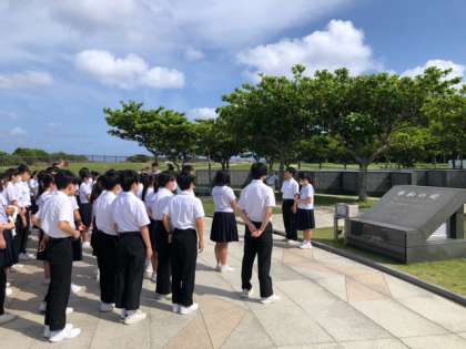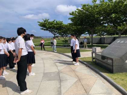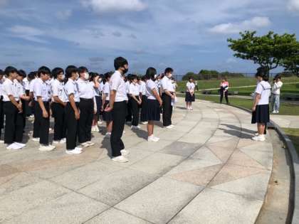 平和セレモニーとして平和の礎の前で、学級代表による平和宣言と黙祷を行いました。