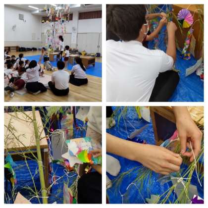 翌日の七夕に向けて、園児と一緒に笹の葉に飾り付けをしました。