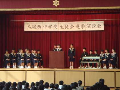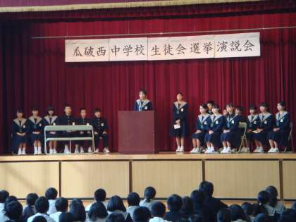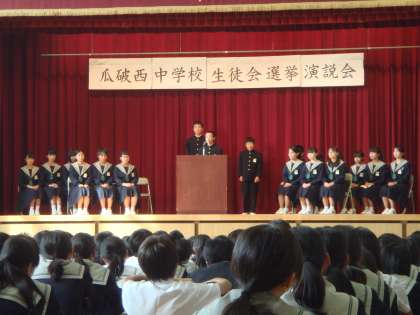 はきはきとしっかりとした口調で頼もしい演説・応援演説でした。現在の「あいさつ運動」や「遅刻0デー」の取り組みをさらに推進して、全校生が過ごしやすい学校を作りたいという内容がほとんどでした。今回は、対立候補がおらず、信任投票で行われました。