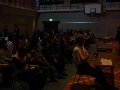 下の写真は、全体での合唱練習と、保護者席の様子です。