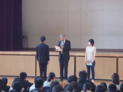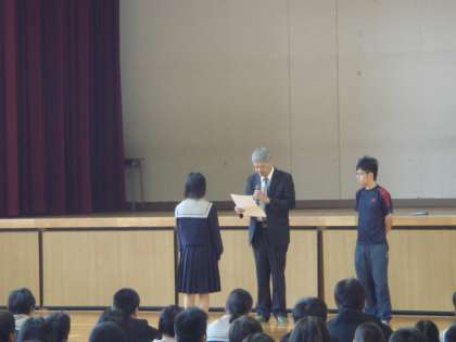 認証式の後、賞状伝達を行いました。総合文化祭の吹奏楽部の発表に対して賞状をいただいたものです。また、美術科の作品で優秀作品が総合文化祭において、展示されました。その生徒に対して、賞状をいただきました。