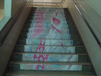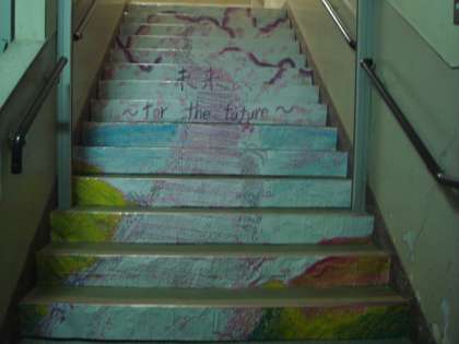 2年生階段アートを玄関入ってすぐの階段に展示しています。手芸部作品も玄関に展示しています。