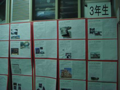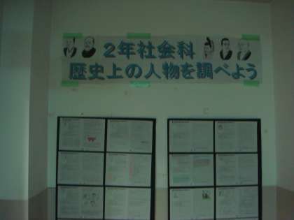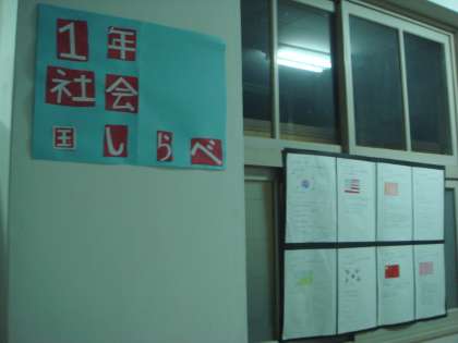社会科は、1年生で国調べ、2年生で歴史上の人物調べ、同和外国人委員会では、反戦・平和学習の展示をしました。