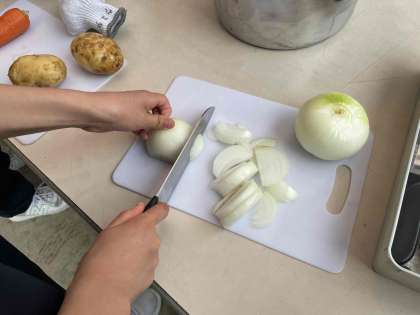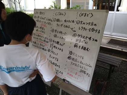 カレー作りの様子です。迷ったときはスタッフの方に教えていただきます。ホワイトボードにも説明がわかりやすく書かれています。