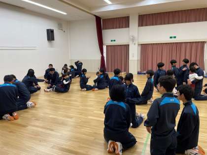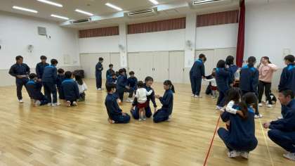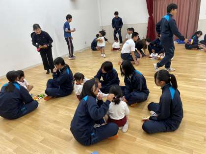 3年生は、この交流のために家庭科の夏休みの宿題でどんなおもちゃを作ろうかと考え、2学期の授業で作成した手作りおもちゃを使って、園児と遊ぶ時間もありました。園児のみなさんからは、「楽しい〜」「もっと遊んで〜」とたくさんの声が響いていました。元気いっぱいの園児たちに囲まれ、3年生も楽しい時間を過ごせたようでした。