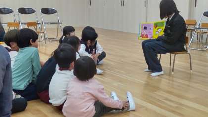 続いて読み聞かせです。園児さんたちはいつになく興味しんしんでした。選んだ絵本がよかったのかもしれません。やっぱりオノマトペが沢山ある方がいいみたいです。