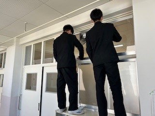 普段は手の届かない高い所やエアコンフィルターの清掃も分担して取り組みました。新しい年度に向かってみんなで準備しています。