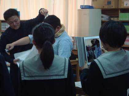 説明の途中の様子を撮影しています。三角巾のいろいろな使い方です。