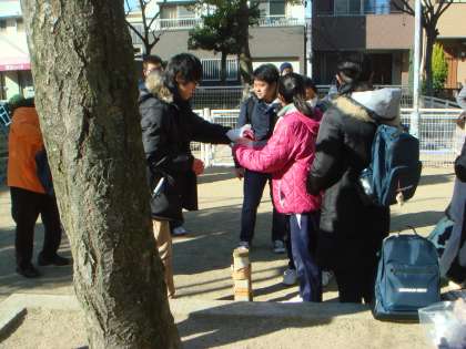 けが人の手当てをしています。再び、本部と連絡をとります。けが人を避難所である瓜破西小に連れて行くことになります。