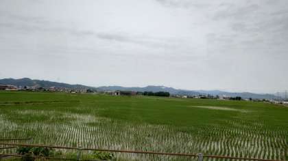 田んぼやビニールハウスなどのどかな風景が漂っています。