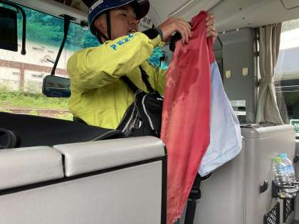 乗船口に到着しました。 バス内でライフジャケット装着の説明を受けています。