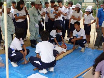 10月5日土曜授業の2,3限目を利用して防災訓練を行いました。地域防災リーダー指導のもと、全校生徒と瓜破西小学校6年生児童が「可搬式ポンプ操作」「救急搬送」「バケツリレー」の3つの訓練に分かれて懸命に取り組みました。
