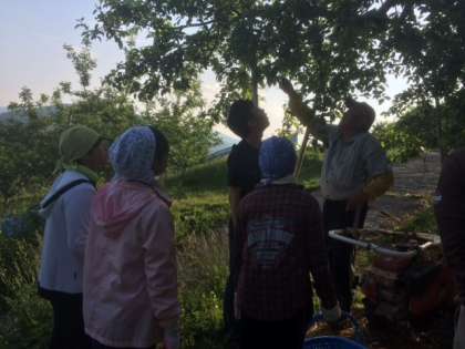 摘花作業の説明を聞いています。真ん中の花に栄養がいくように周りの花を摘みとるそうです。