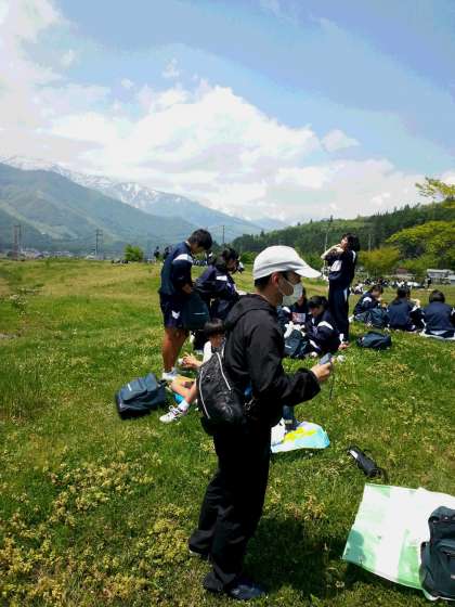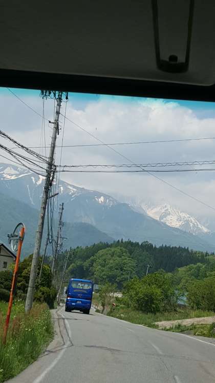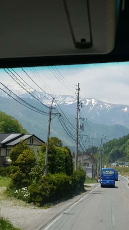 退村式の後、バスで移動します。白馬村につきました。今から、昼食です。天気は、最高です。