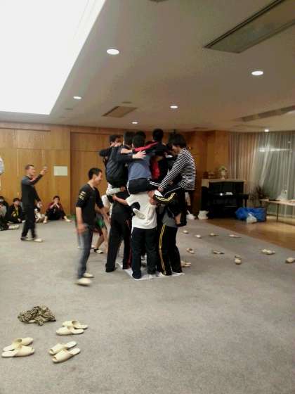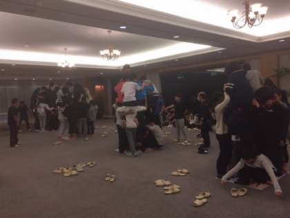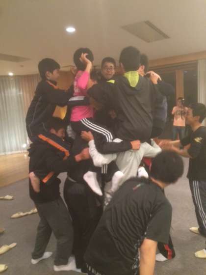 昨日のレクの続きです。新聞紙の上に何人乗れるか。競っています。