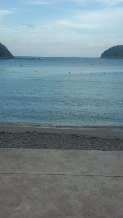 昨日の夜は、部屋にクーラーを入れてもらっていました。自然の風が爽やかと聞いたので、生徒たちの寝付いたあと、クーラーを切り、窓を開けました。朝方、波の音と磯の香りで、目覚めた生徒も多かったのでは、ないでしょうか?今、寝具の片付けをしています。写真は、日高の朝6時の写真です。少し、曇っています。