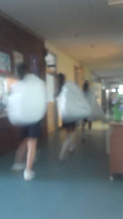 すると、突然、季節外れのサンタクロースの集団が、前を通過しました。プレゼントの配り忘れかと思えば、シーツの返却でした。