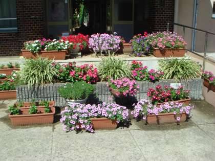 9/3(土)に写真を撮りました。玄関付近では、こんな風に植込みのあたりが、色とりどりの花で鮮やかになっています。学校にお立ち寄りの節はご覧ください。