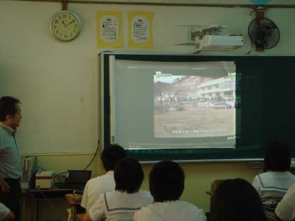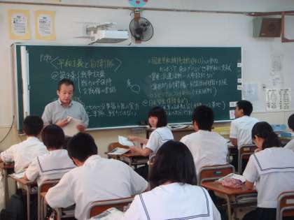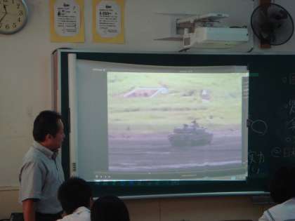 液晶プロジェクターを使用し、自衛隊の被災地での活動の映像を映す一方で、自衛隊の戦闘機などの映像も映すことで、平和主義と自衛隊について考えることができた。さすが、3年生と言える授業態度で熱心に学習していました。