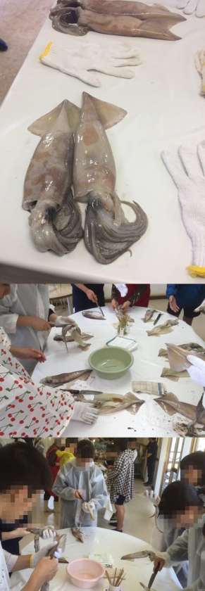 2日目のイベント、イカの一夜干し体験です。地元の人に教わりながらイカをさばいています。軍手と大きさを比較してください。