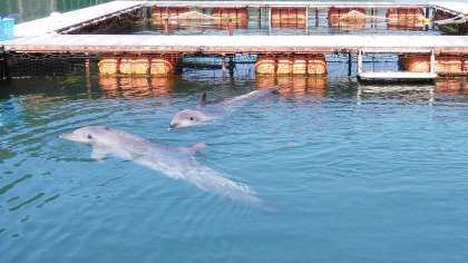 イカの加工場のすぐ横には公園があって、イルカのプールもあります。水族館などで芸をするイルカがここで出番を待っているのです。