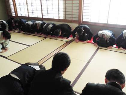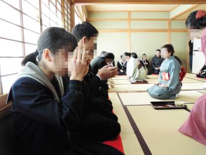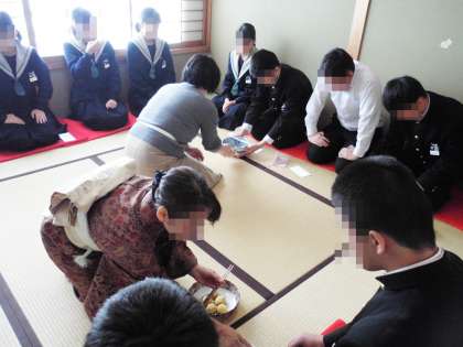 3年生を対象に、地域の方に講師をお願いして茶道教室を開きました。本格的な茶器で抹茶をいただきながら、礼儀作法を教わりました。
