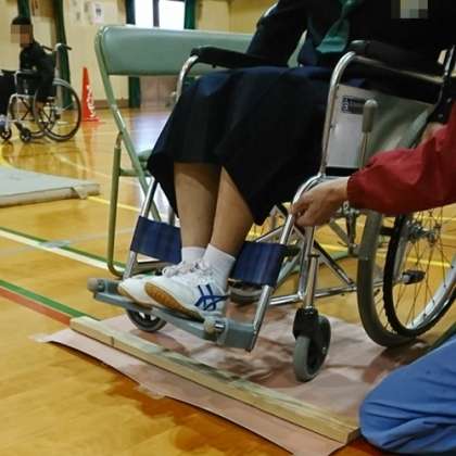 午後の2時間を使って車いす体験をしました。最初は体育館の中に、段差やスロープの機材を置いて、わざと通りにくくしました。角材を乗り越える写真がありますが、2cmの高さしかなのに、タイヤが回らなくなってしまいました。平らな床では難なく進めましたが、段差がある介助が必要です。