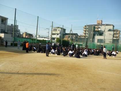 各教室でパソコンを使った防災教育の後、緊急放送に従いスムーズに運動場に避難しました。