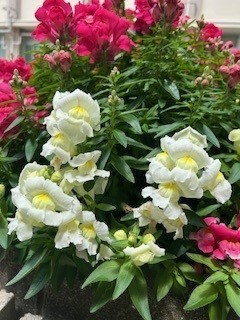 右はなかよし花壇のキンギョソウ(名前の通り金魚を思わせる愛らしい花の姿が魅力です)